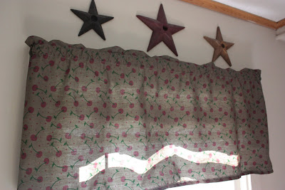 like making curtains and thrifting plates make me extremely happy. One of the things I am enjoying is making for all the different rooms at this house. We have an actual laundry room on the first floor, (which is awesome!!) It is big enough to keep a table in, acts as a pantry & it needed some window treatments. This fabric was found at walmart, (sigh... I know,) and was on the clearance rack. I was able to make two valances for about $1.60. The cherry print is rather refreshing from all the floral prints that I pick up.
